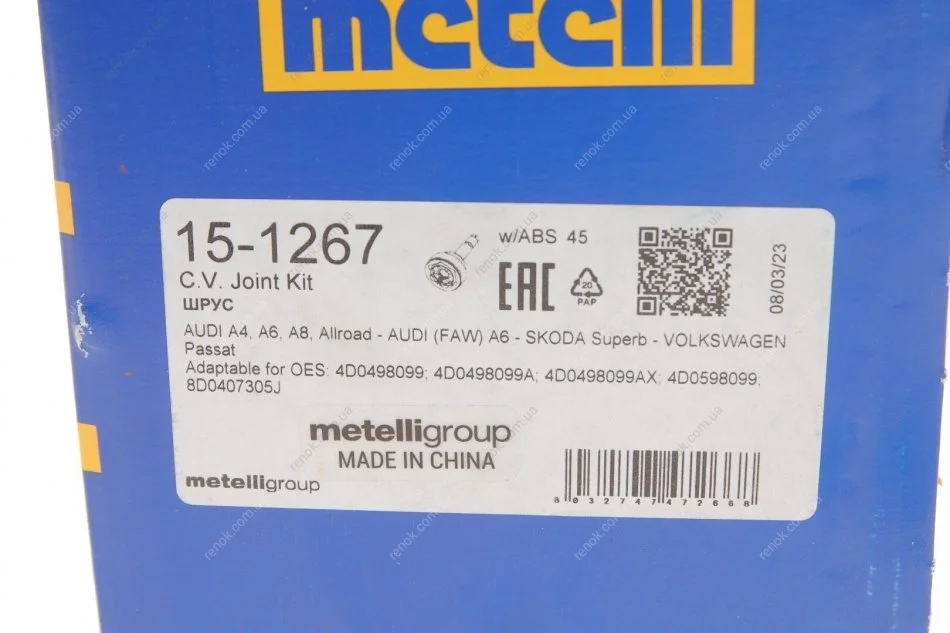 ШРКШ (зовнішній) Audi A4/A6/A8/VW Passat 94-05/Skoda SuperB 01-08 (38z/27z/59.5mm/98mm/34mm)(+ABS45z) Metelli 15-1267 (4D0498099, 4D0598099, 8D0407305J)