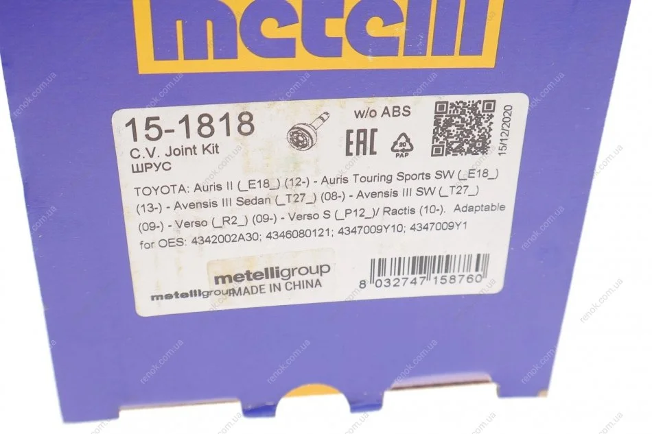 ШРКШ (зовнішній) Toyota Auris II 1.3 12-18/Toyota Avensis III 1.6-2.0 08-18 (26z/23z) Metelli 15-1818 (4347009Y10, 4346080121, 4342002A30)
