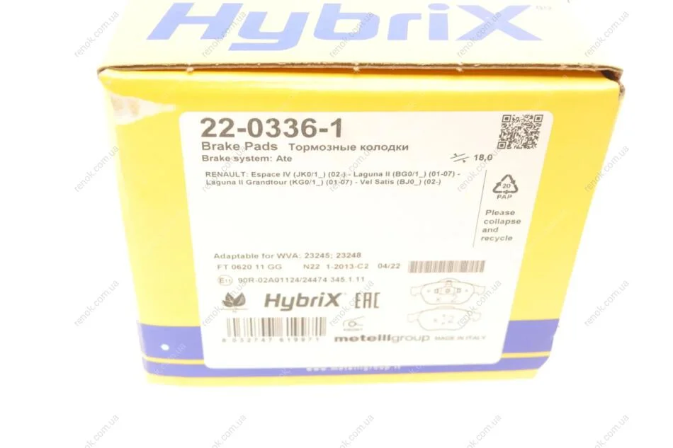 Колодки гальмівні (передні) Renault Laguna II 01-07/Espace IV/Vel Satis 02- Metelli 22-0336-1 (7701209810, 7701207977, 7701207615)