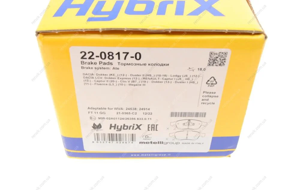 Колодки гальмівні (передні) Dacia Dokker/Duster/Lodgy/Nissan Juke/Renault Clio V/Kangoo 10- Metelli 22-0817-0 (440603905R, 410607115R, 410605961R)