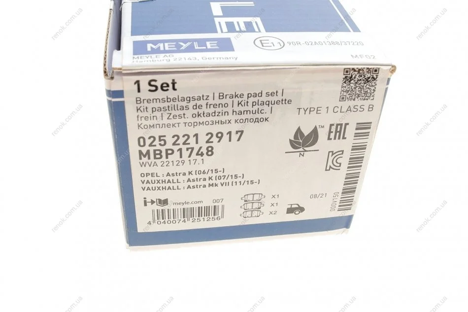 Комплект гальмівних колодок MEYLE 025 221 2917 (13517515, 95526568, 39037199)