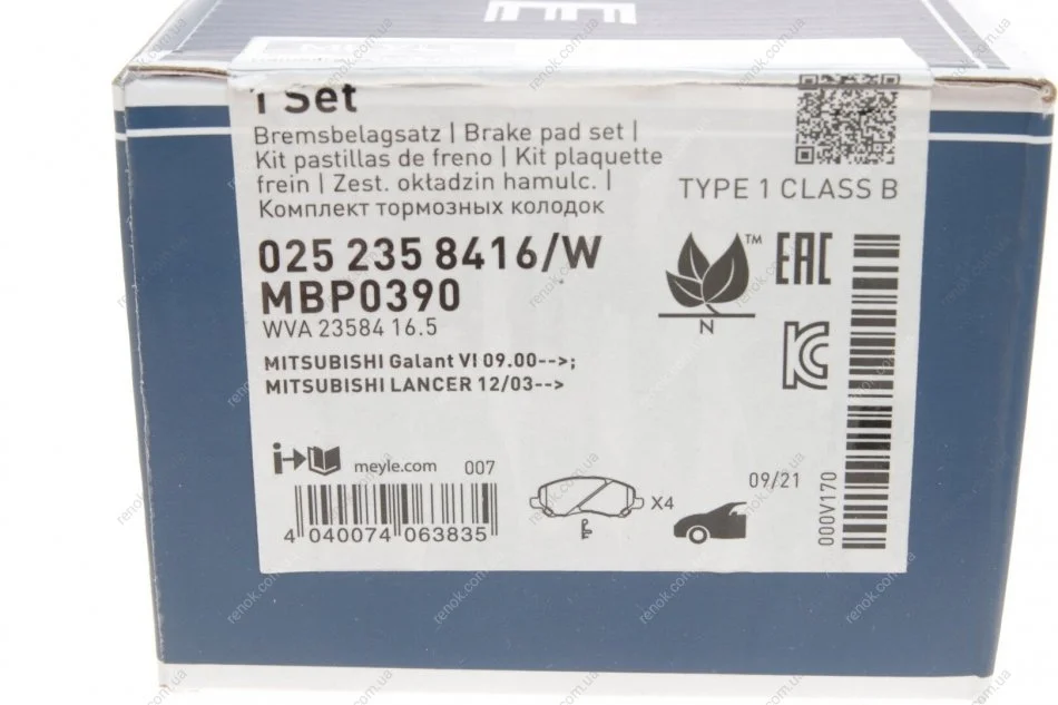 Колодки гальмівні (передні) Mitsubishi Lancer VII/VIII 03-/Jeep Compass/ Patriot 06- MEYLE 025 235 8416/W (1607690380, 1607690480, 05191229AA)
