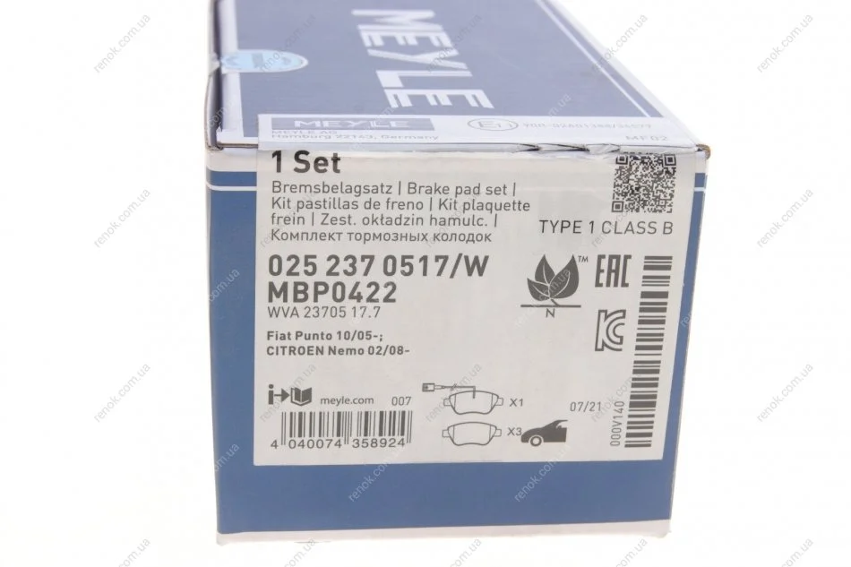 Колодки гальмівні (передні) Fiat Doblo/Citroen Nemo/Peugeot Bipper 08- (Bosch) MEYLE 025 237 0517/W (425407, 425406, 425496)