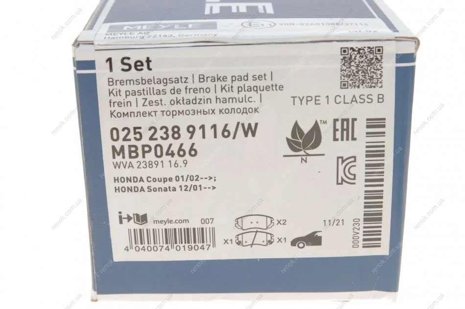 Колодки гальмівні (передні) Hyundai Sonata/Tucson/Kia Sportage 01- MEYLE 025 238 9116/W (581012CA10, 581012CA20, 581012EA10)