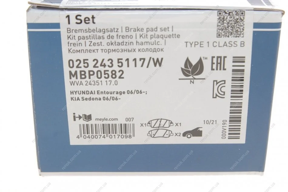 Колодки гальмівні (передні) Hyundai Santa Fe/Kia Sorento 00- MEYLE 025 243 5117/W (581012SA70, 581012BA10, 581012PA70)
