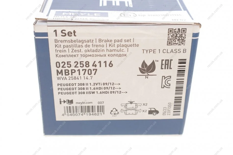 Комплект гальмівних колодок MEYLE 025 258 4116 (1610814180, 1647875680, 1619791480)