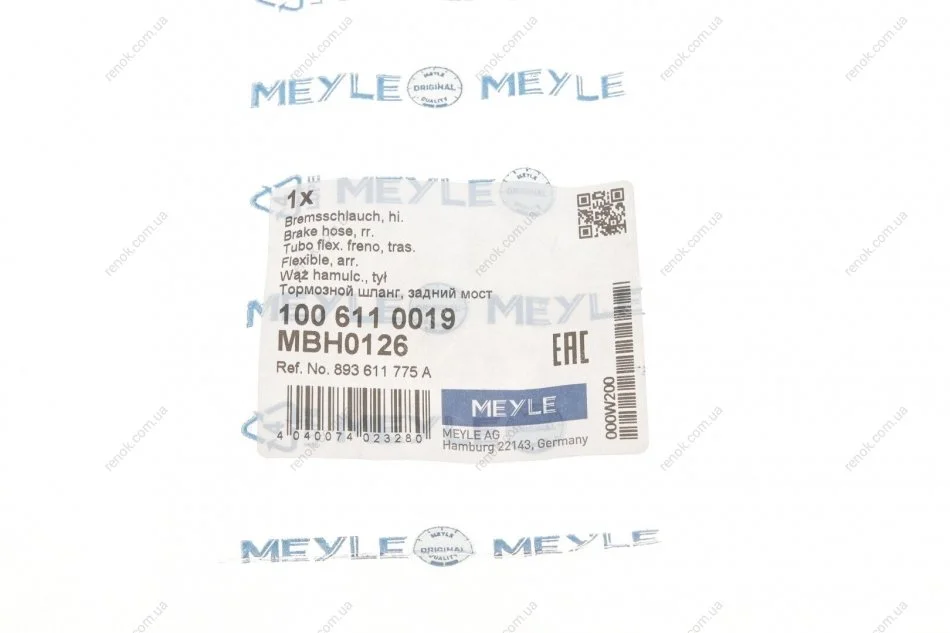 Шланг гальмівний (задній) VW T4 91-03 MEYLE 100 611 0019 (893611775A, 7D0611775C)