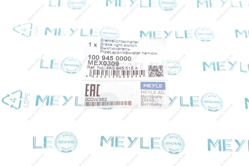 Датчик педалі гальма VW Passat/Audi A4/A6/A8 1.6-3.0 94-05 (4 конт.) MEYLE 100 945 0000 (4A0945515A)