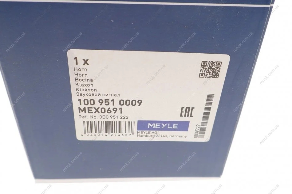 Сигнал звуковий VW Caddy II/T4 90-04 (низький тон/410-510Hz) MEYLE 100 951 0009 (191951223, 191951221, 893951221)