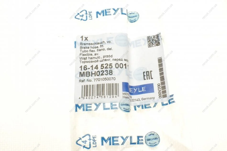 Шланг гальмівний (передній) Renault Laguna II 01-07 (L=390mm) MEYLE 16-14 525 0011 (7701050070)