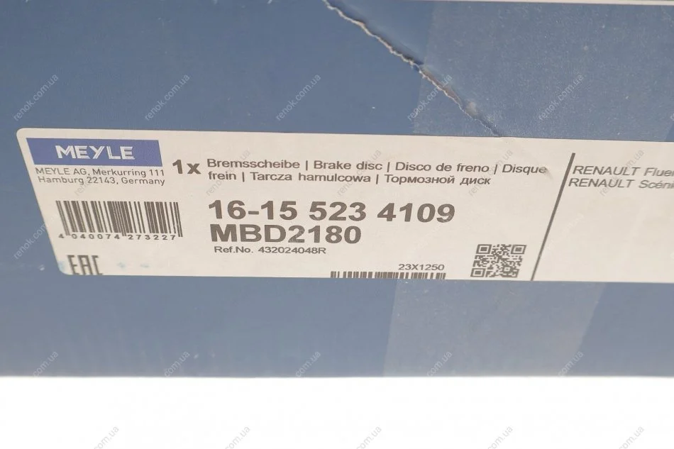 Диск гальмівний (задній) Renault Scenic III 09- (274х11) (+ABS) (з підшипником) MEYLE 16-15 523 4109 (432020984R, 432000007R, 402029646R)