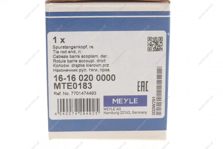 Наконечник тяги рульової (R) Renault Kangoo 97- MEYLE 16-16 020 0000 (7701474493, 7701047416, 7701474813)