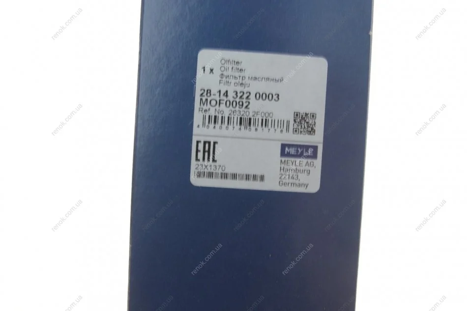 Фільтр масляний Hyundai Santa Fe/Kia Sorento 2.0/2.2 CRDi 09- MEYLE 28-14 322 0003 (263202F000, 263202F010, 263202F100)