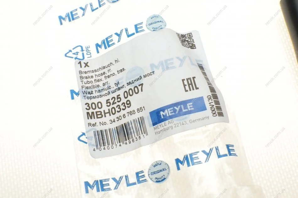 Шланг гальмівний (задній) BMW 3 (E90/F30/F80)/X1 (E84) 04-19 (L=265mm) N20/N43/N44/N46/N52/N55 MEYLE 300 525 0007 (34306762837, 34306768851, 34306789431)