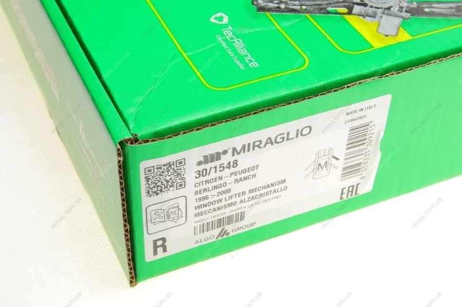 Склопідіймач (передній) Citroen Berlingo/Peugeot Partner 96- (R) (електро) (без моторчика) MIRAGLIO 30/1548 (9221G1, 807015F600, COMPLETESYSTEM)