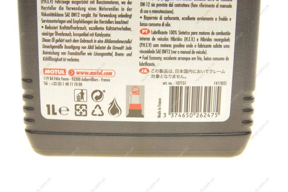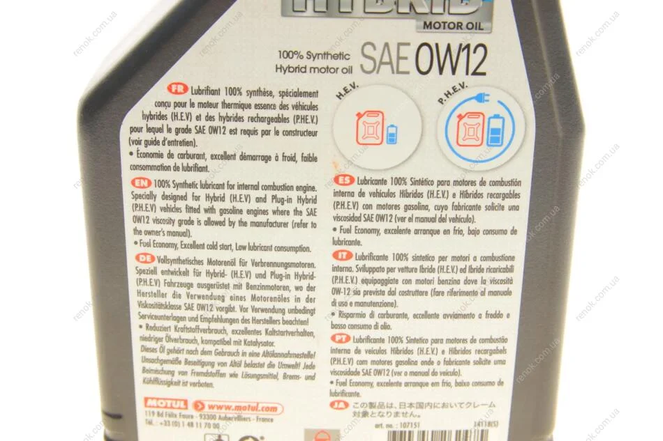 Олива 0W12 Hybrid (1L) (107151) (SAE J 300/ASTM D1298/ASTM D445/D4741/D2270) заміна на MOTUL 333301