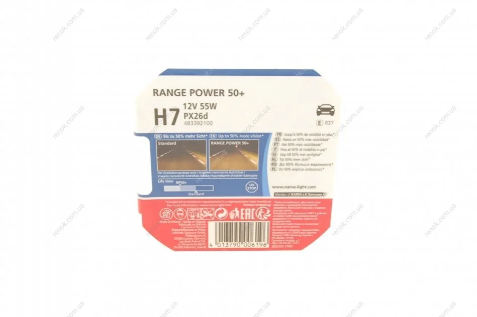 Автолампа H7 12V 55W PX26d Range Power 50 + (к-кт 2 шт.) NARVA 483392100