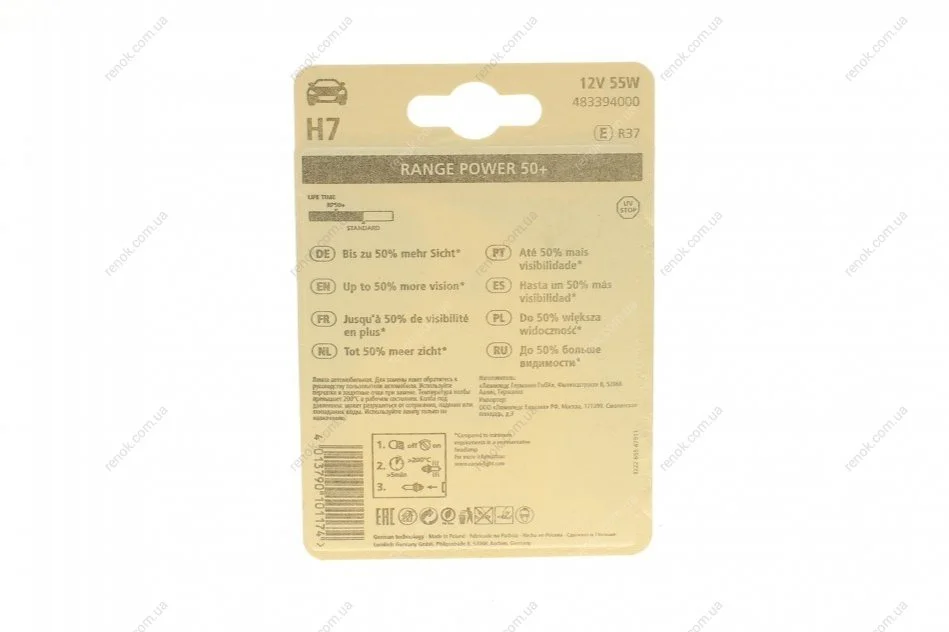 Автолампа H7 12V 55W PX26d Range Power 50+ (блістер/ 1шт) NARVA 483394000