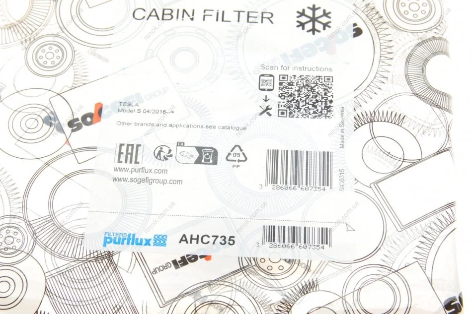 Фільтр салону Tesla Model-S Electric 15- (вугільний) Purflux AHC735
