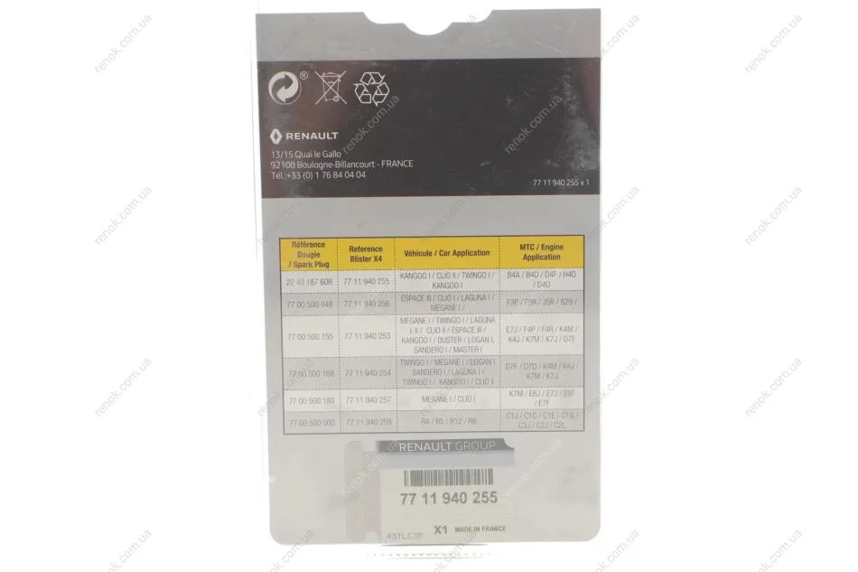 Свічка запалювання (к-кт 4шт.) Kangoo/Logan/Sandero 1.2i 01- RENAULT 7711940255 (224018760R)