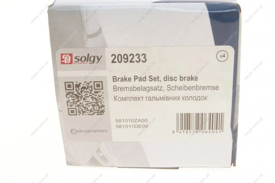 Колодки гальмівні (передні) Kia Sportage/Carens III 04- SOLGY 209233 (581010ZA00, 581011DA00, 581011DA50)