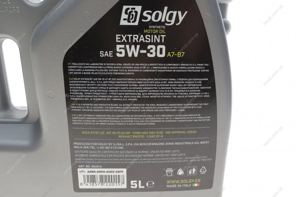 Олива моторна EXTRASINT SAE 5W-30 A7-B7 (5 L) SOLGY 504016 (214354, 214355)