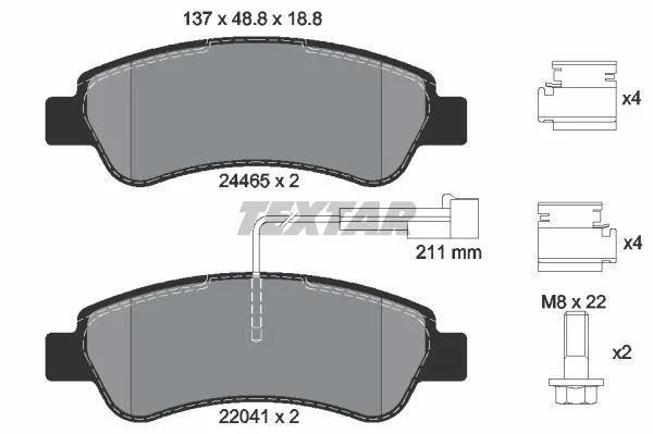 Комплект гальмівних колодок задн (з комплектуючими з вбудованим датчиком зносу з гвинтами гальмівного супорта), CITROEN JUMPER II FIAT DUCATO OPEL MOVANO C PEUGEOT BOXER 2.0D-3.0D 04.06- TEXTAR 2446503 (1614412180, 1612434180, 77366679)