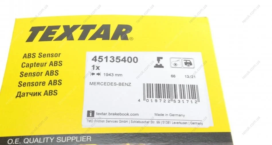 Датчик ABS (задній) MB Sprinter/VW Crafter 11- (L) (L=1943mm) TEXTAR 45135400 (9065404117, 9069050801, A9065404117)