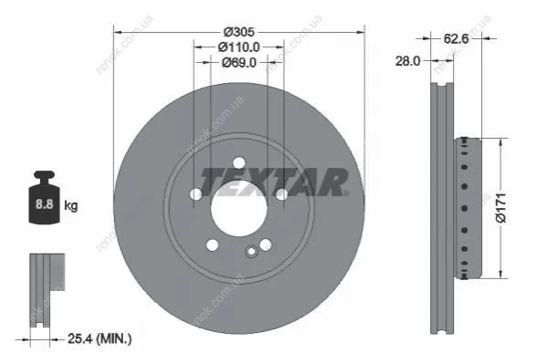 Диск гальмівний (передній) MB C-class (W205)/E-class (W213) 13- (305х28) PRO+ TEXTAR 92343625 (0004212512, A0004212512)