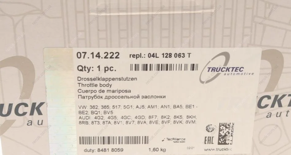 Заслонка дросельна VW Caddy III/IV 2.0 TDI 10- TRUCKTEC 07.14.222 (04L128063B, 04L128063J, 04L128063N)
