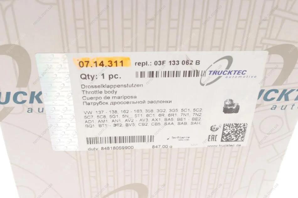 Корпус заслонки дросельної VW Caddy IV 1.2/1.4/1.6 TSI 15-20 TRUCKTEC 07.14.311