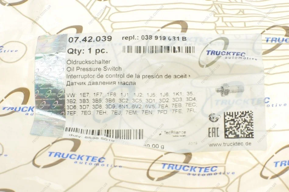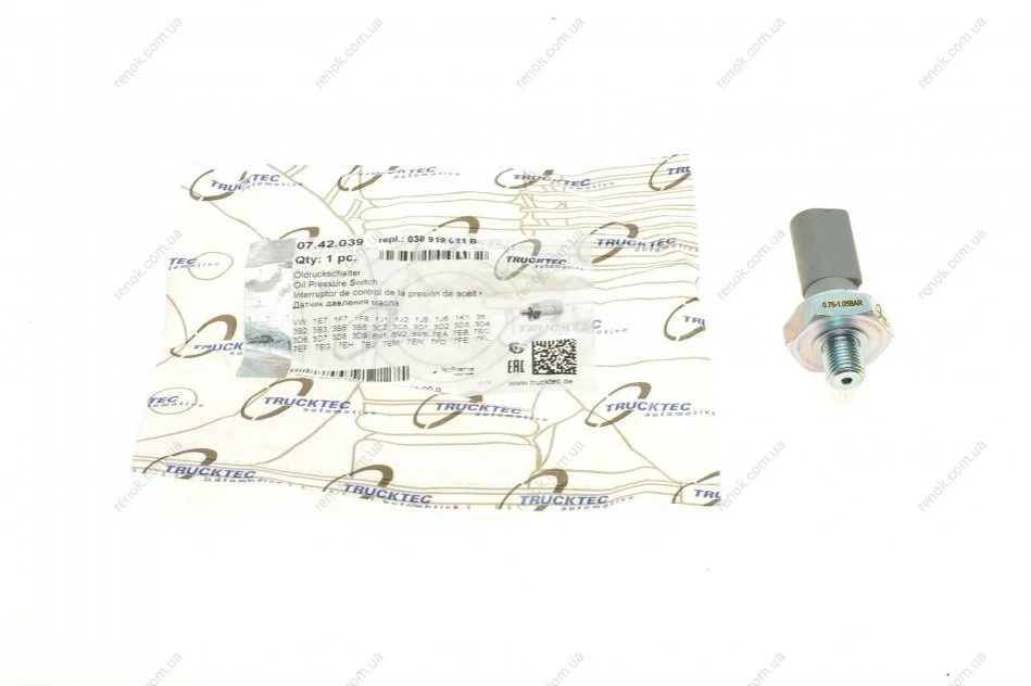 Датчик тиску оливи VW Caddy 1.9TDI/T5 2.0-2.5TDi 95- (0.75-1.05 bar) (сірий) TRUCKTEC 07.42.039 (038919081B, 038919081G, 038919081M)