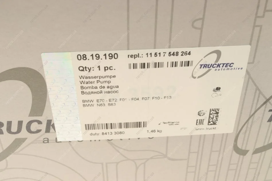Помпа води BMW 5 (F10)/7 (F01/F02/F03/F04)/X5 (E70)/X6 (E72/E72) 07- TRUCKTEC 08.19.190 (11517548264, 11517548263)