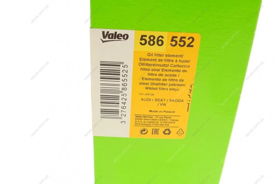 Фільтр масляний Audi A3/A4/A6/Q3/VW Golf V/VI/Passat 2.0 FSI 04- Valeo 586552 (06D115466, 06D198405, 6D115466)