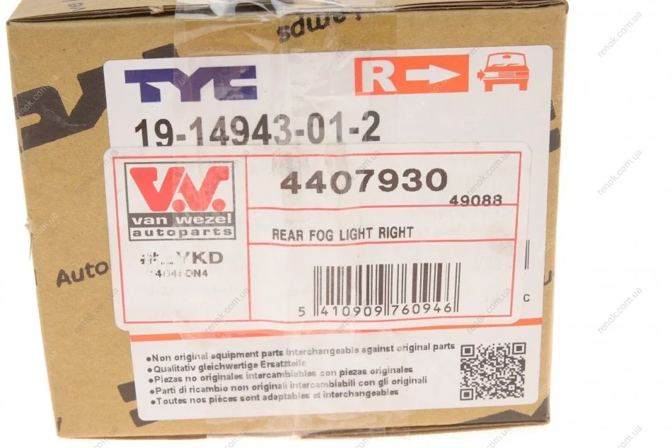Ліхтар задній протитуманний Renault Megane IV 15- (R) Van Wezel 4407930 (265804720R, 265806717R)