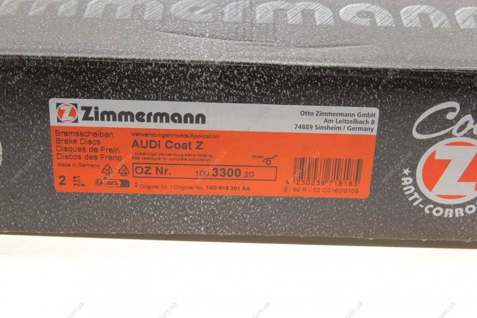 Диск гальмівний (передній) VW Caddy III 04- (312x25) (з покриттям) (вент.) ZIMMERMANN 100.3300.20 (561615301, JZW615301H, 5Q0615301F)