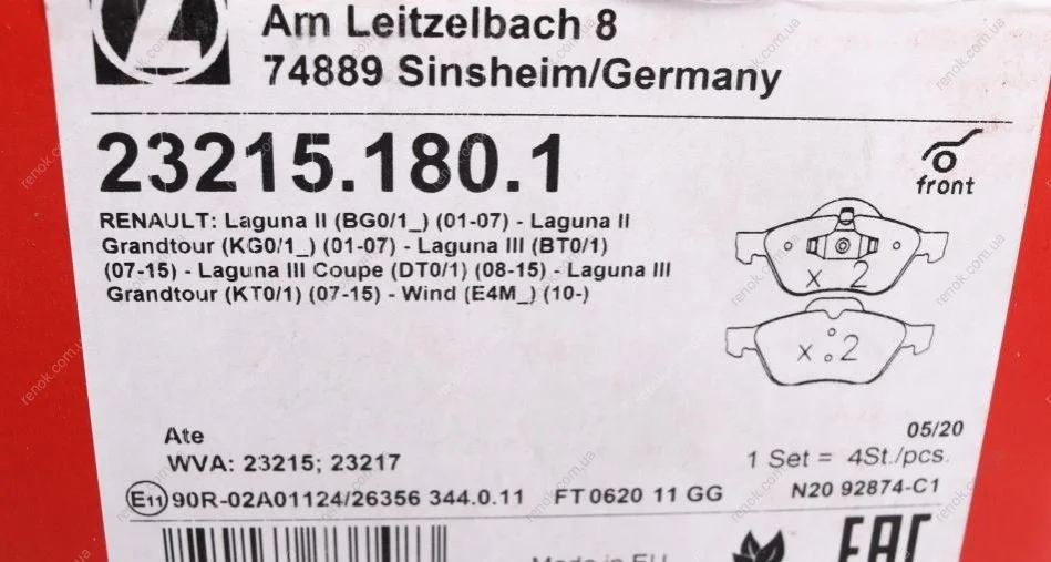 Колодки гальмівні (передні) Renault Laguna II 01-07 (Ate-Teves) ZIMMERMANN 23215.180.1 (410600012R, 410607690R, 7701206598)