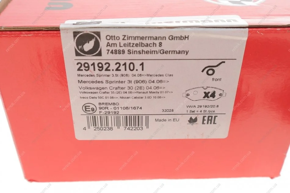 Колодки гальмівні (передні) MB Sprinter (906) /Vito (W639) (Brembo) ZIMMERMANN 29192.210.1 (9064210700, 9104207200, 9104207600)