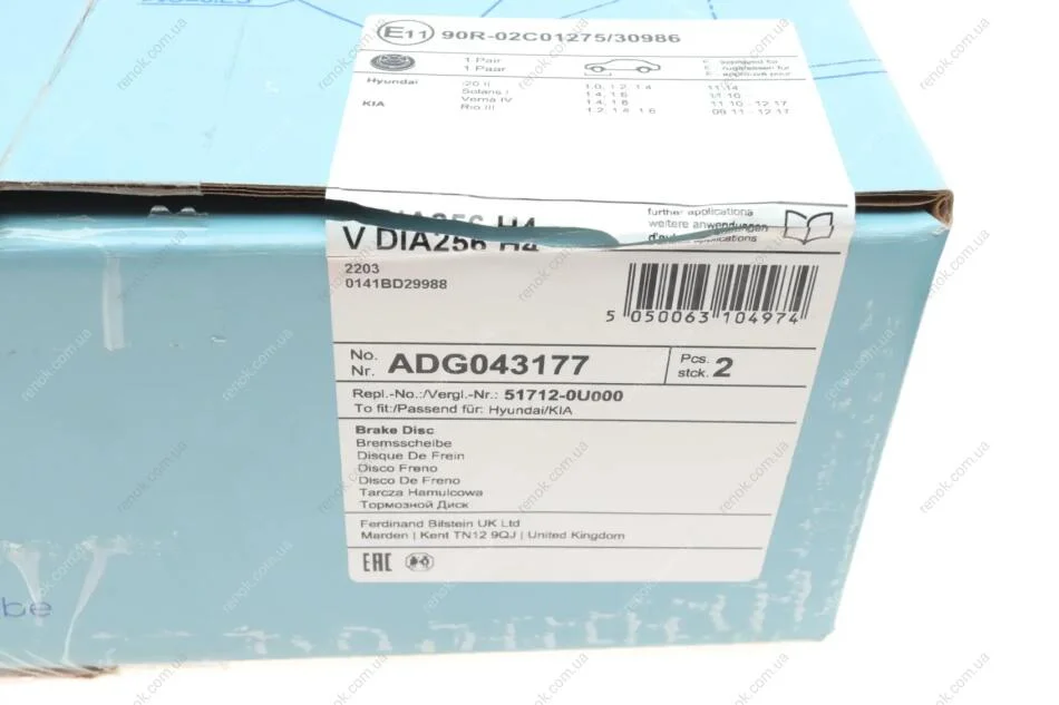 Диск тормозной (передний) Kia Rio III/Hyundai i20 11- (256x22) BLUE PRINT ADG043177 (517121W200, 517121W250, 517120U000)