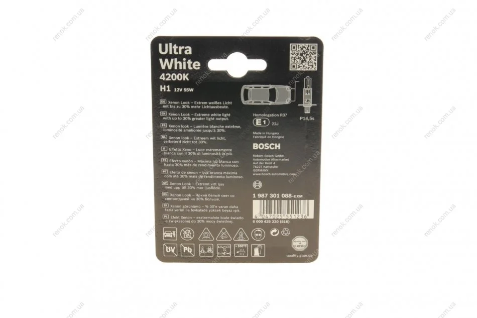 Автолампа H1 12V 55W P14.5s Ultra White BOSCH 1987301088 (000000000268, 000000000375, 621622)