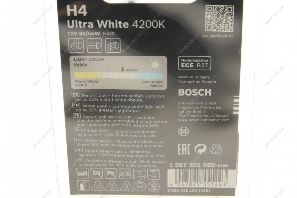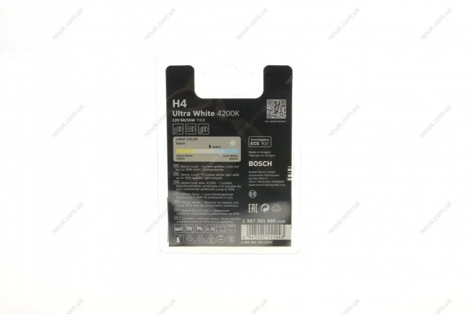 Автолампа H4 12V 60/55W P43t Ultra White 4200K (BL) (заменено 1 987 301 152) BOSCH 1987301089