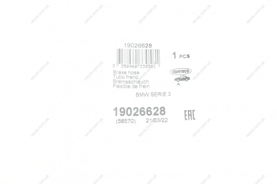 Шланг тормозной (передний) BMW 3 (E46) 99- CORTECO 19026628 (34321165587, 34326766966)