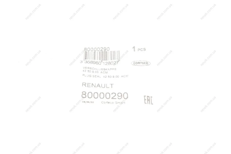 Заглушка ГБЦ Renault Master 2.5dci (43x9) (для распределительного вала) CORTECO 80000290 (7700105749, 7703075328)