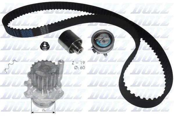 VW К-кт ГРМ (помпа + 2 ролика + ремень + гайка) T5 1.9TDI, Touran -10, Polo 01- DOLZ KD054