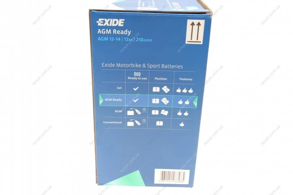 Аккумуляторная батарея 14Ah/210A (134x89x164/+R/B0) (AGM) (мото) EXIDE AGM12-14