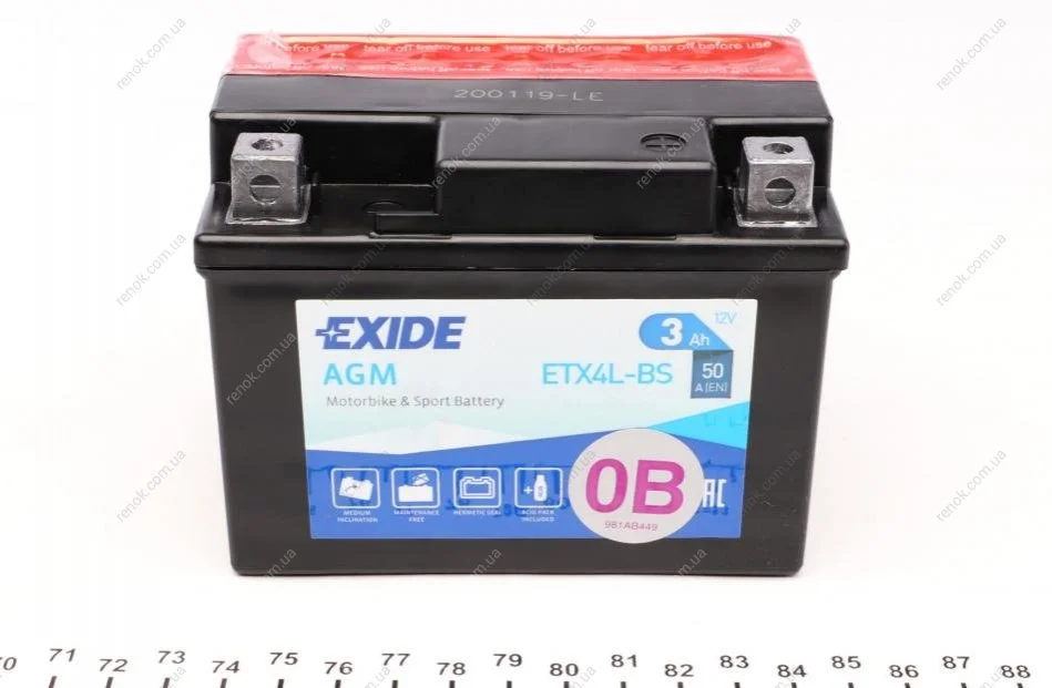 Аккумуляторная батарея 3Ah/50A (113x70x85/+R/B0) (AGM) (мото) (сухозаряженный) EXIDE ETX4L-BS