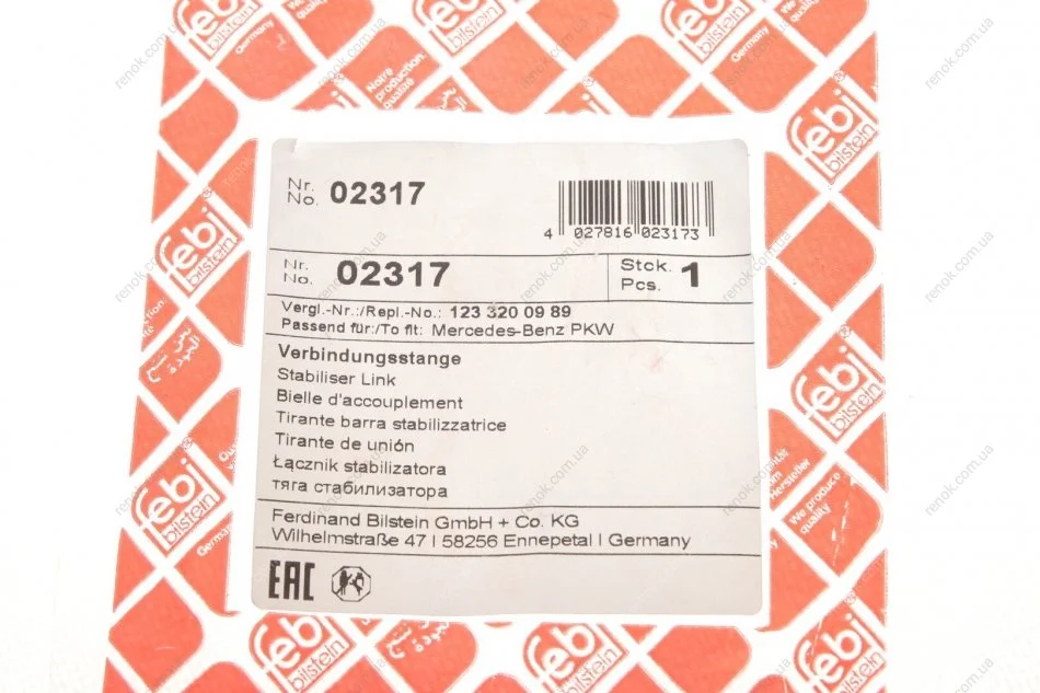 Тяга стабилизатора MB SPRINTER FEBI FEBI BILSTEIN 02317 (a1233200989, A1233230416, A1153201589)