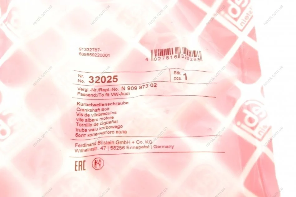 Гвинт шестерні колінвала FE32025 FEBI FEBI BILSTEIN 32025 (n90987302, N90987301, 3D105171B)