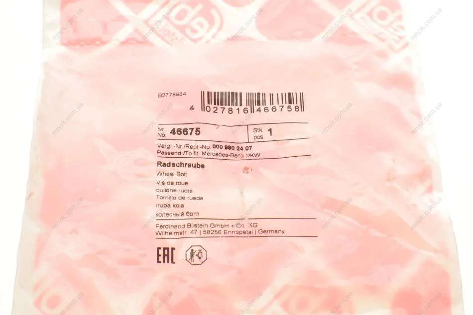 Болт колеса MB Sprinter/VW Crafter 06- (M14x1.5mm) FEBI BILSTEIN 46675 (0009902407, 68006805AA, WHT000888)