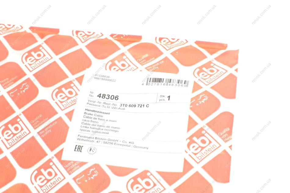 Трос ручника (задний) Skoda Superb 08-15 (1615/805mm) FEBI BILSTEIN 48306 (3T0609721C)